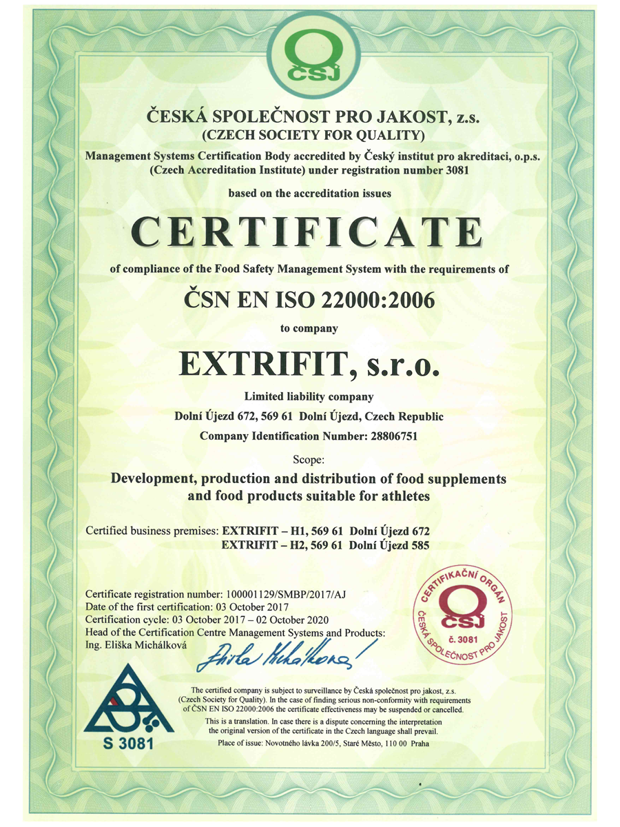 Extrifit Das Unternehmen hat den Zertifizierungsprozess erfolgreich verabschiedet und das ISO 22000: 2006 -Zertifikat erworben. Der ISO 22000 -Standard ist eine internationale Kraft des Anwalts und ein wichtiger Standard für die Bewertung von Organisationen, die spezifische Anforderungen an die Lebensmittelsicherheit in der gesamten Lebensmittelproduktion/der Lieferkette anwenden. Nicht nur die Verwaltung des Unternehmens, Einhaltung der HACCP -Prinzipien, sondern auch die Einführung anderer Sicherheitspraktiken. Wie eine gute operative Managementpraxis, eine gute agrokulturelle Praxis, gute Tierarztpraxis, gute Hygienepraxis, gute Vertriebspraxis, gute Sanitärpraxis und so weiter. Dieses Zertifikat erworben haben Extrifit Es kann garantiert werden, dass ihre Produkte sicher und hohe Qualität sind. |