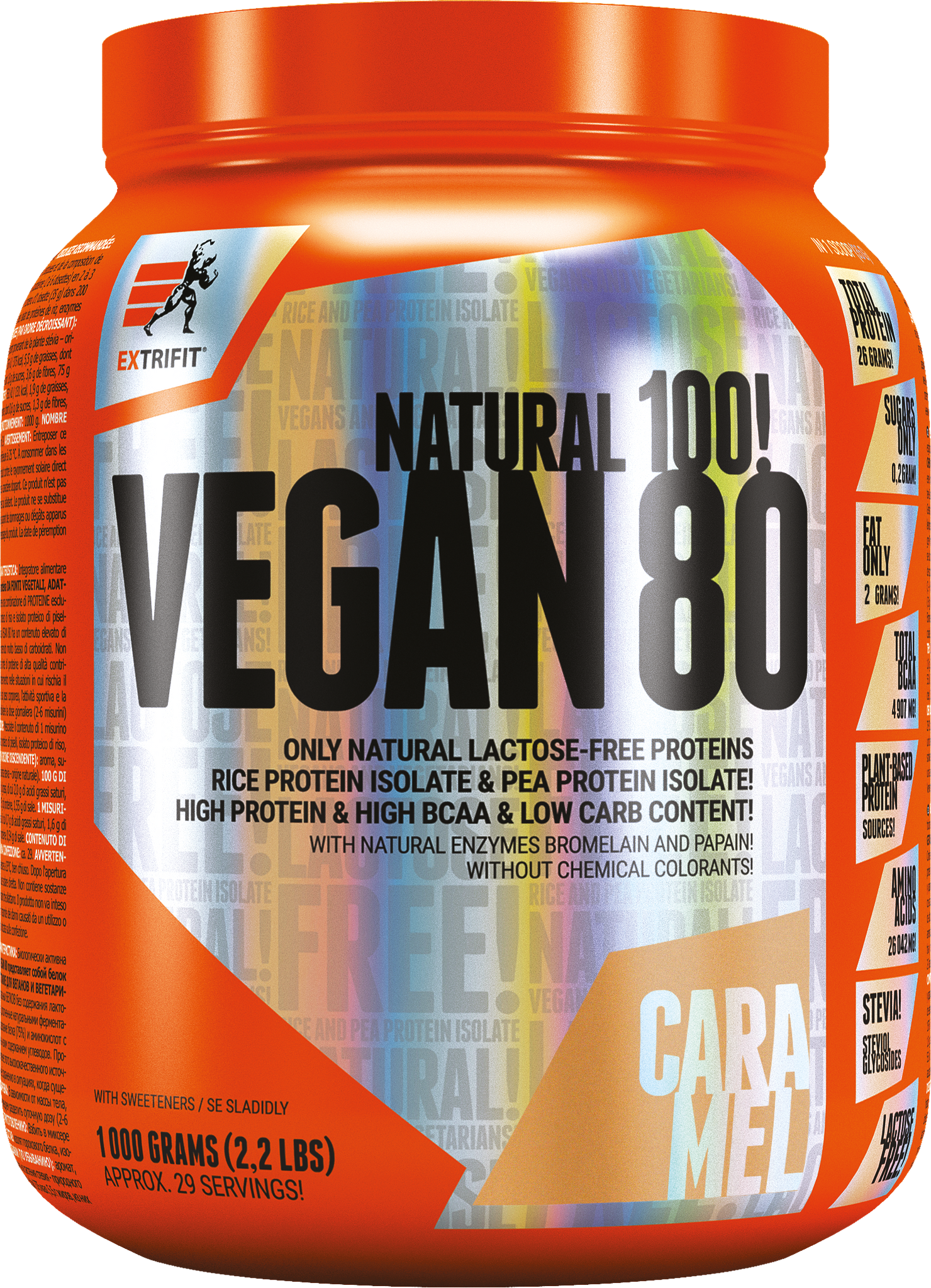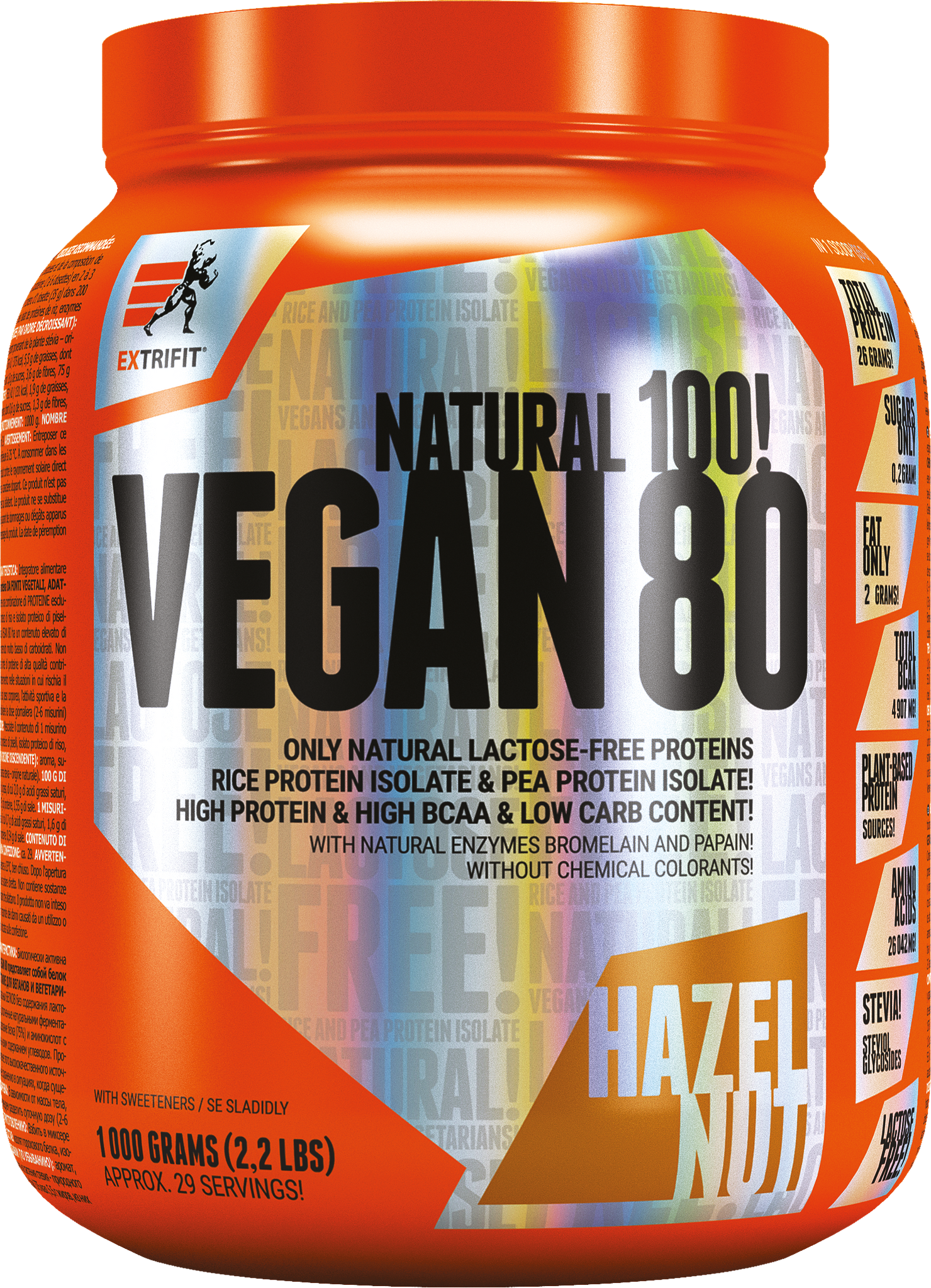 Extrifit® Vegan 80 - Proteinisolation nur aus Pflanzen! Ohne Laktose! Eine tolle Alternative zu Molken- und Milchprotein. Diese Premium -Pflanzen -Isolation hat hervorragende Parameter. Auf einer Anzeige 'Extrifit® Vegan 80 ”enthält bis zu 75% Protein und bis zu 5000 mg BCAA. Dies bedeutet, dass die Proteinquelle für Molkenprotein vollständig glatt ist und der Aminosäuregehalt gleich ist - daher ist er für die Wiederherstellung und Kultivierung der Muskeln sehr geeignet.